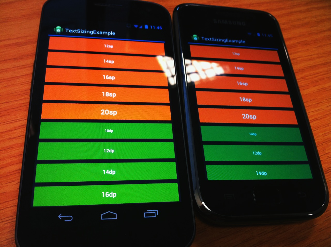 The text blocks are all 48dp high, also the suggested sweet-spot for hitbox heights. They are demoing different text sizes that one might set in both sp and dp measurements. (sp will grow if someone turns on large text in the system settings, dp won’t). These screens are very different in terms of pixel counts and physical sizes, yet android performs very well in making them almost physically identical to my eyes and fingers. The nexus screen does look better of course.