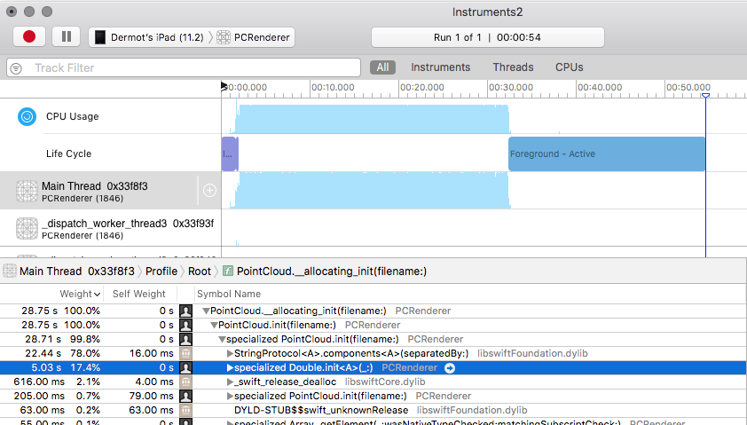 We can also run the app under the Time Profiler to get an idea of what parts of the init method are taking so long.