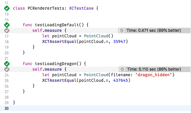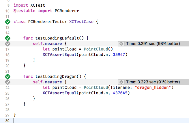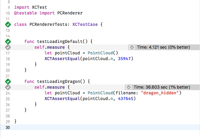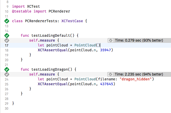 First, we make a small tweak to the PointCloud class, to allow us to specify the name of the model file to load. Then we write a unit test class, as shown below and run it. The measure test block executes the code 10 times and gives an average.