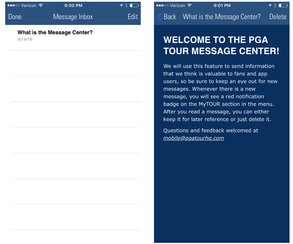 The message centre is a great way to provide content on the other features within your app. An icon appears over the message centre to indicate each time a new message has been added.