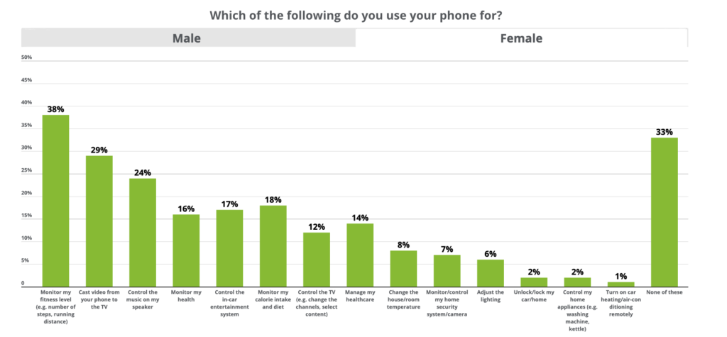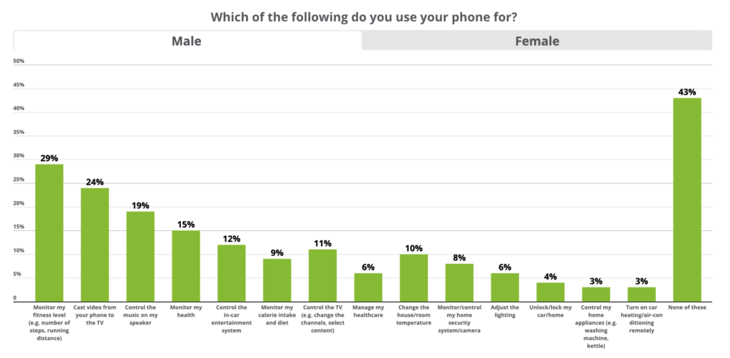 In Deloitte’s 2019 Report females use their mobile phones more in almost every category. From monitoring their fitness to casting videos from their phone to the TV to controlling the music on their speaker, monitoring their health, controlling their in-car entertainment system and managing their healthcare, females surpassed males in all of these categories. Males had only slightly more usage in categories such as unlocking/locking their car or home, controlling home appliances and turning car heating and air-conditioning on/off remotely.