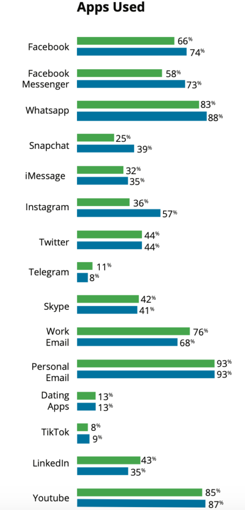 Below is the breakdown of the apps used between males and females. The trend is pointing towards females using more social apps than males but males using work emails and LinkedIn more. It has also been noted on the report that 38% of females play online games compared to 22% of males but 27% of males use their phones for online gambling compared to 16% of females. Both male and females use dating apps in similar proportions with 12% for males and 13% for females.