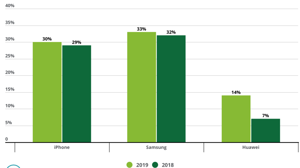 Below is the market share split between the big brands, iPhone, Samsung and Huawei. While Samsung and iPhone had minimal growth Huawei’s growth doubled in the last year from 7% to 14%. According to the report no other brand in Ireland has a market share greater than 3%.
