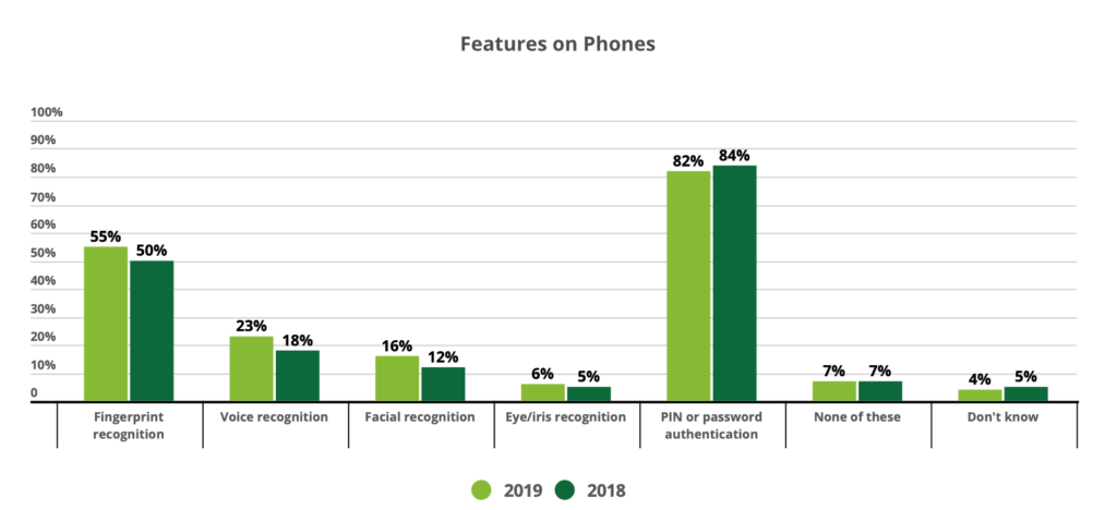 Although PIN or password authentication is still the most used form of authentication for accessing phones there has been an increase in other methods of biometric authentication. Fingerprint recognition has jumped from 30% in 2017 to 44% in 2019 and facial recognition has jumped from 1% in 2017 to 8% in 2019. There has also been a 3% decrease in PIN/password authentication from 2017 to 2019.