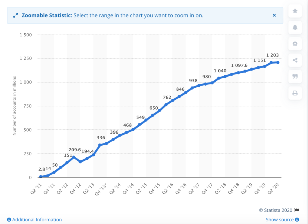 In the second quarter of 2020 WeChat had over 1.2 billion monthly active users from a wide range of age groups. The graph below shows WeChats growth from launch in the second quarter of 2011.