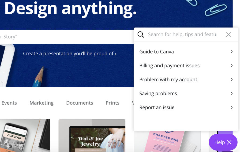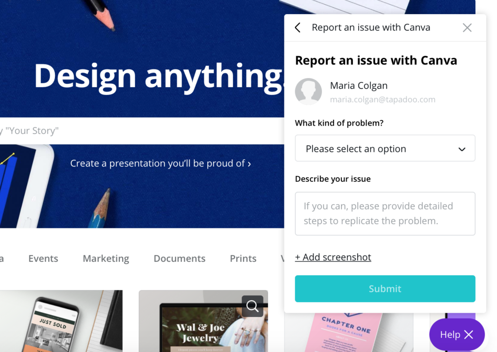 Canva provides an unobtrusive but constantly present in-app feedback mechanism. They place the prompt in the bottom right-hand corner so as not to interrupt the user experience yet obvious enough for users to report a problem if needed. Users are encouraged to provide screenshots and be as detailed as possible.