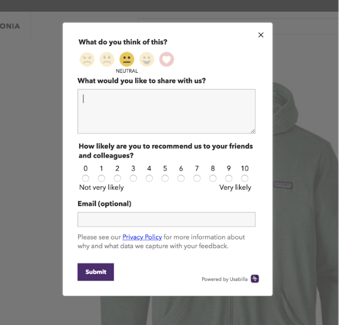 Patagonia provides sleek in-app feedback mechanism. It captures all feedback on one screen making it more inviting for users to provide the feedback. It also offers a mixture of smiley face emojis, open-form feedback boxes, and NPS score. This is covering all in-app feedback in one setting.