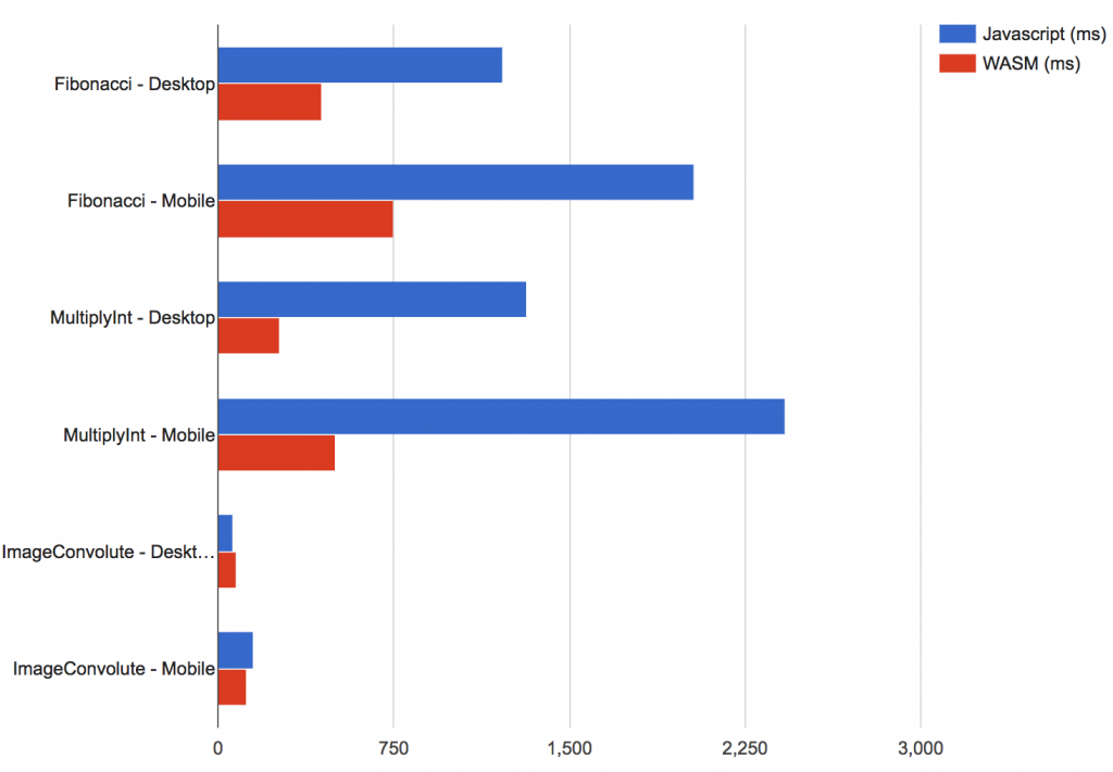 Below, is a quick example of the performance benefits of WASM vs JS on a OnePlus 3 & MacBook Pro 2015 model