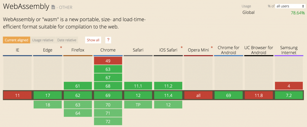 One of the first questions asked when choosing a new tool for the web is browser compatibility, and how this affects the audience you are targeting. WASM is currently supported by 78% of global users as shown below